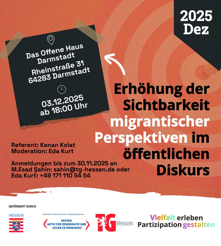 📍 Wo: Das Offene Haus Darmstadt, Rheinstraße 31 📅 Wann: 03.12.2025 | ab 18:00 Uhr 🎙️ Referent: Kenan Kolat 🎤 Moderation: Eda Kurt