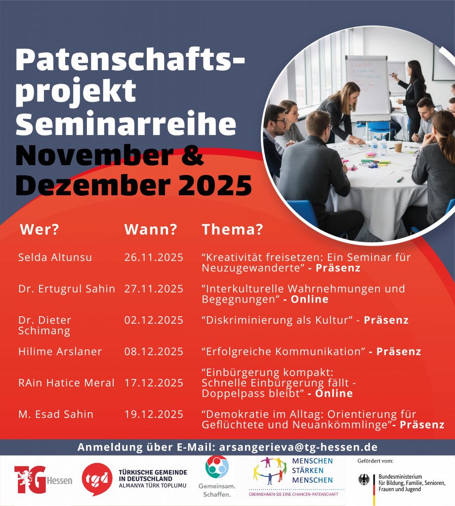 Das Patenschaftsprojekt präsentiert seine spannende Seminarreihe im November und Dezember 2025. Wir bieten eine vielfältige Auswahl an aktuellen und relevanten Themen – von interkultureller Kompetenz bis zu Fragen rund um die Einbürgerung und Demokratie.